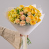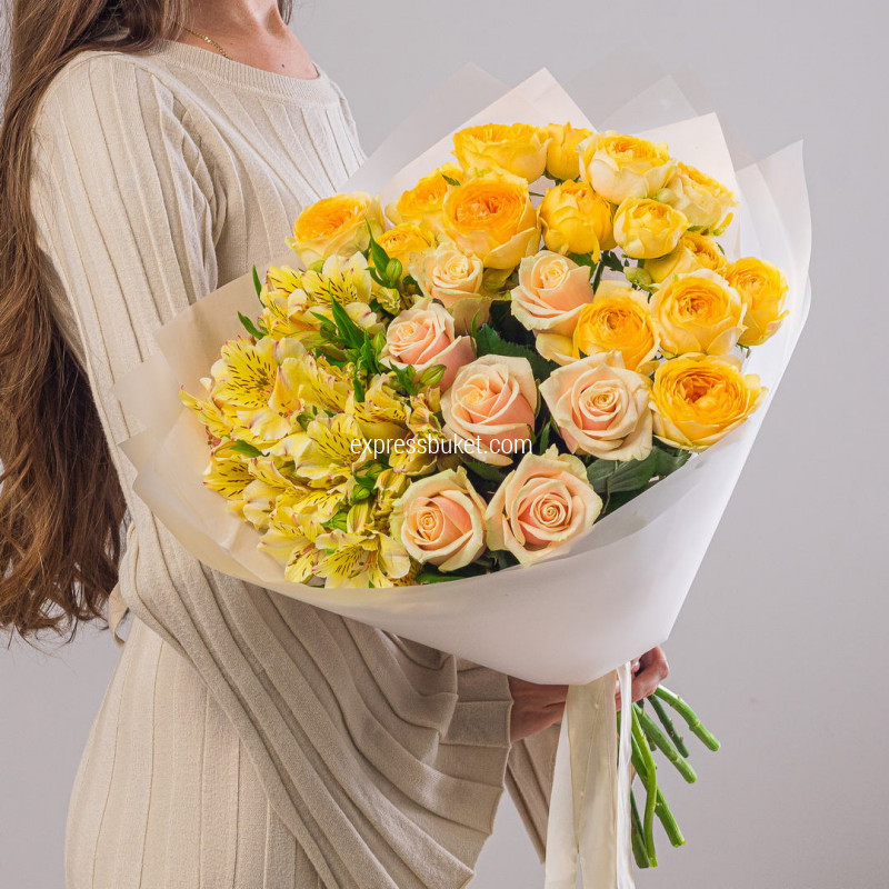 Лента атласная - 1;Современная упаковка - 1;Альстромерия - 4;Роза кустовая пионовидная - 4;Роза Талеа (50см) РОССИЯ - 7;