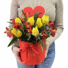 Вставка "сердце" - 1;Коробка шляпная средняя (от 12 до 21 см) - 1;Оазис - 1;Тюльпан - 9;Альстромерия - 4;Фисташка - 3;